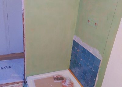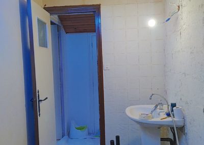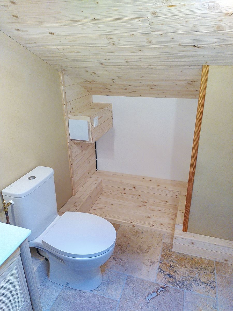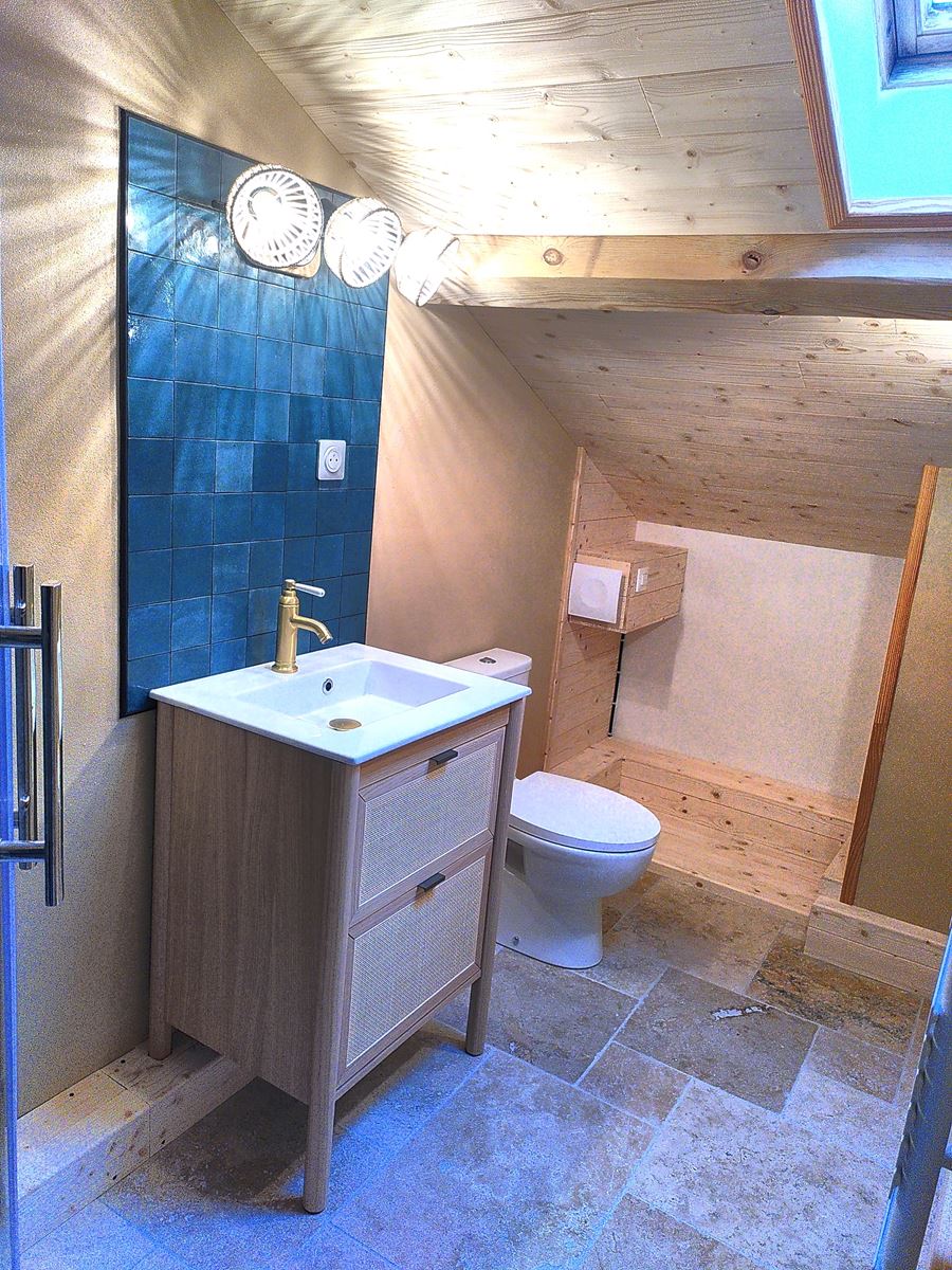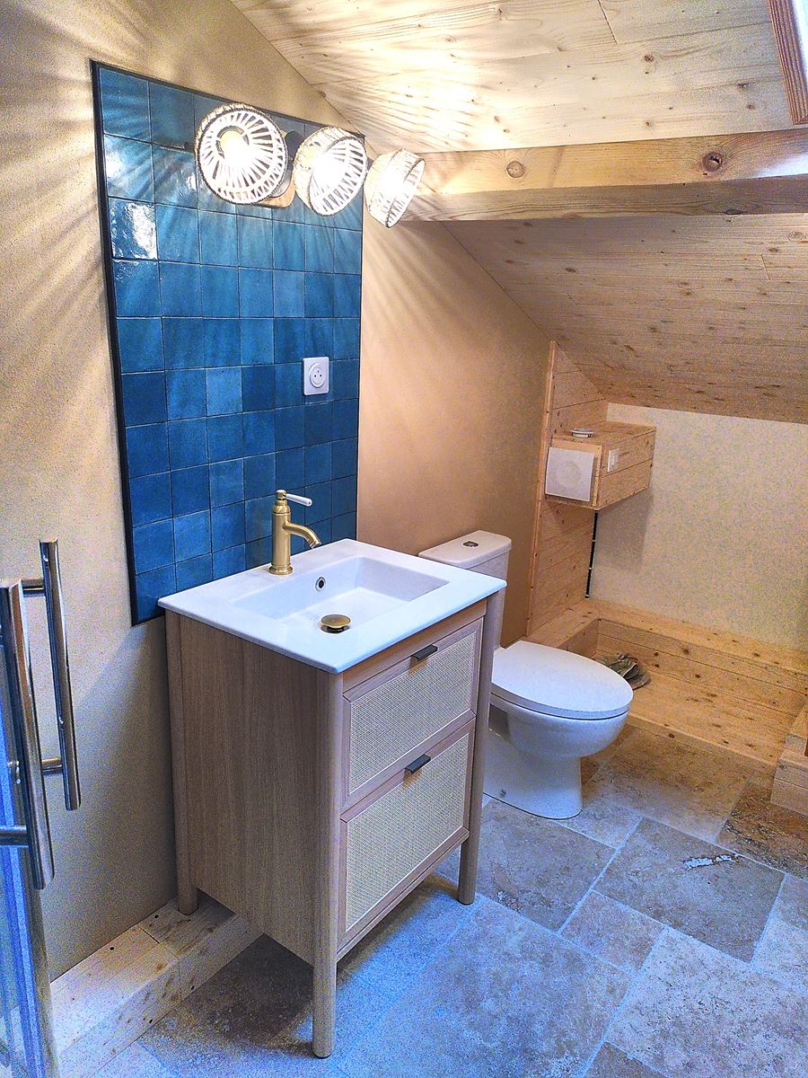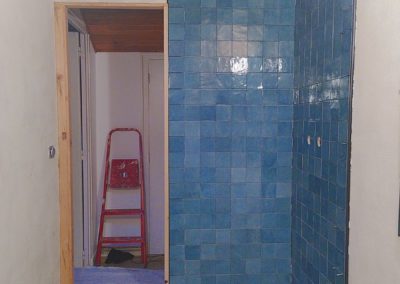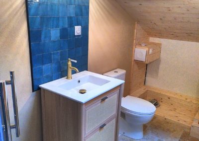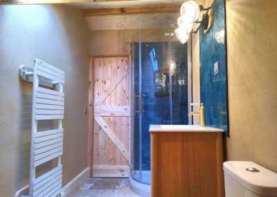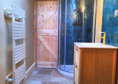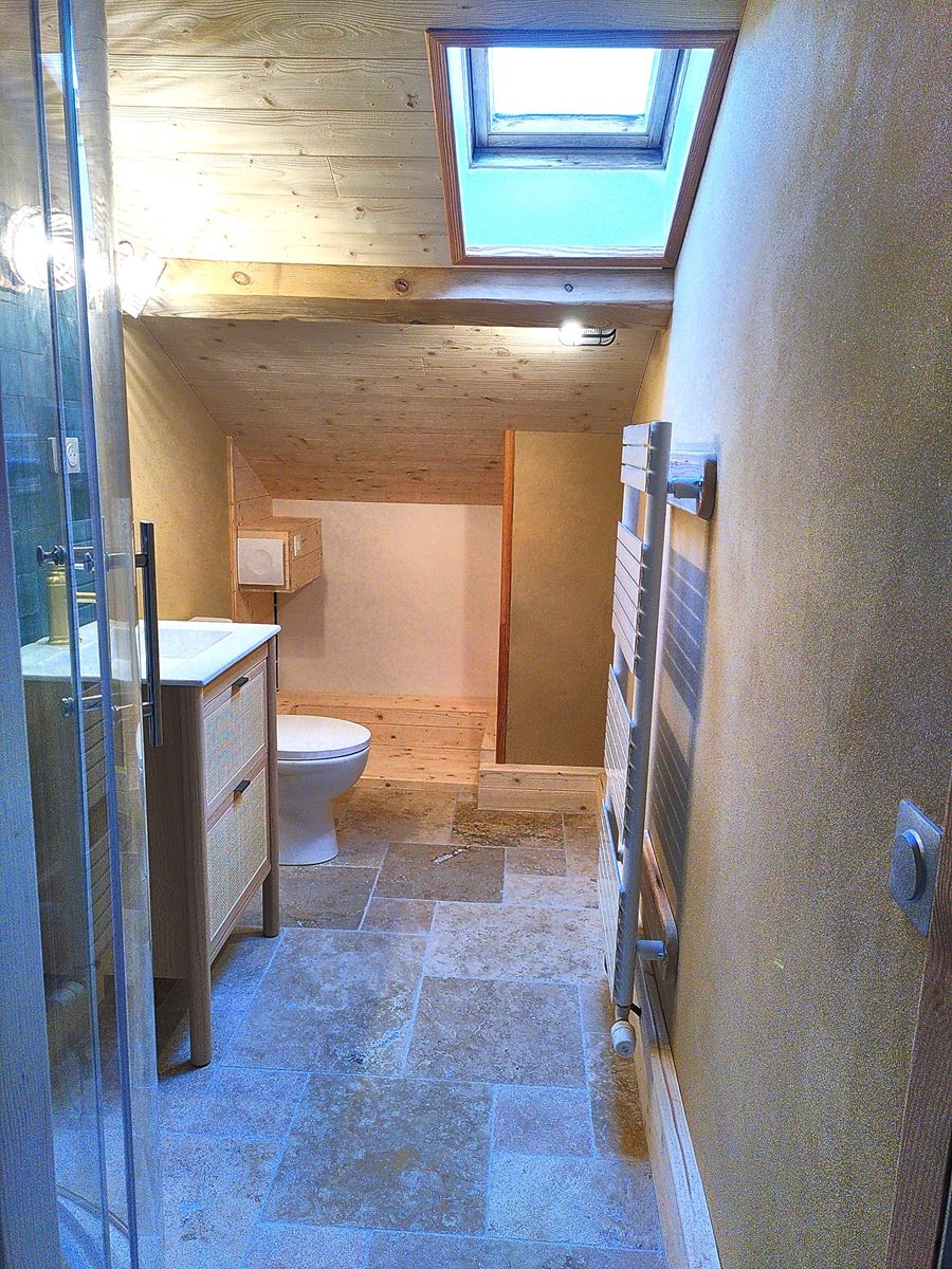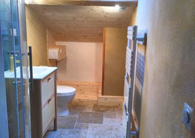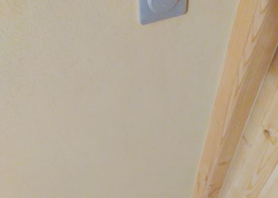 -Enduit argile ton crème au dessus du lavabo et ton naturel pour le reste de la pièce, très bon régulateur d’humidité.