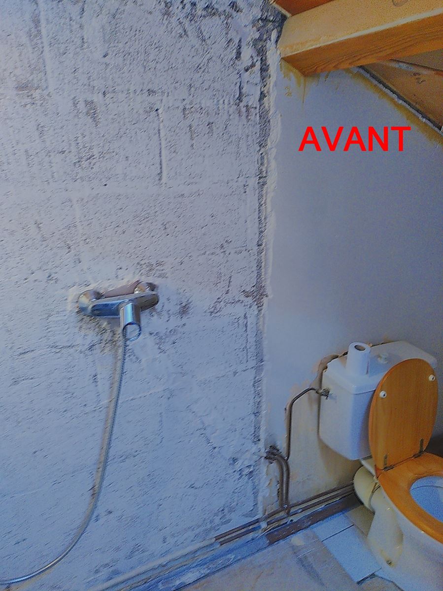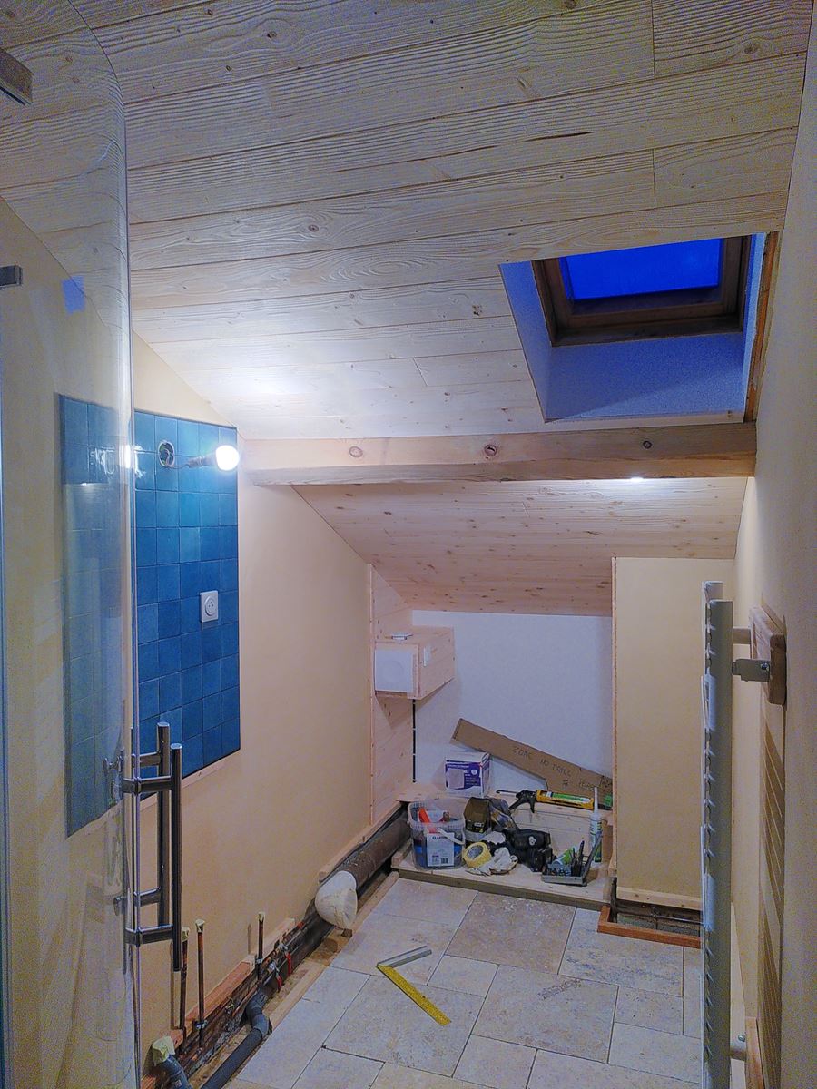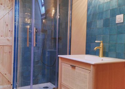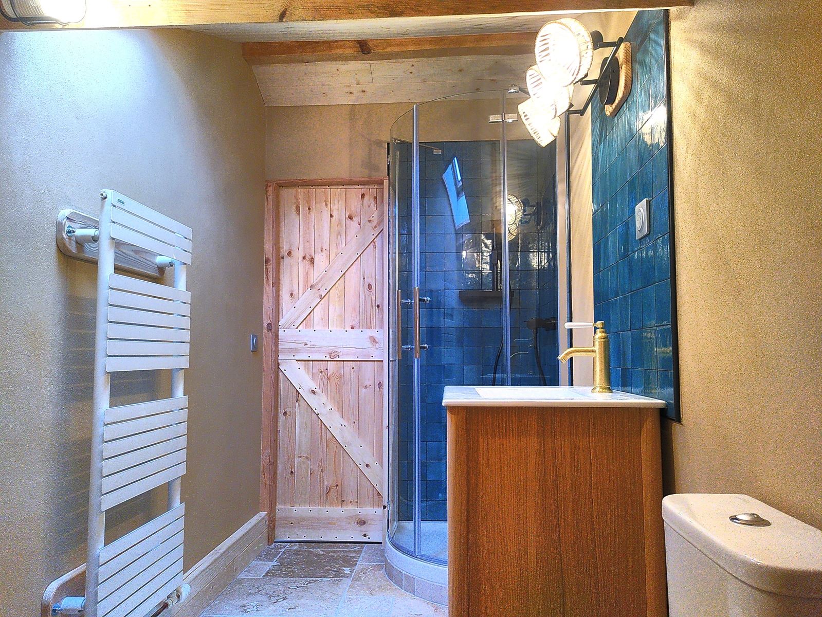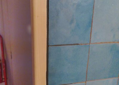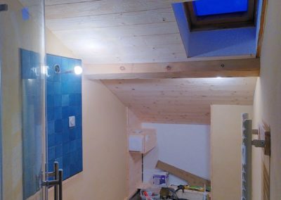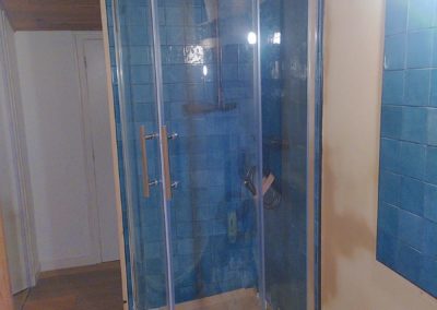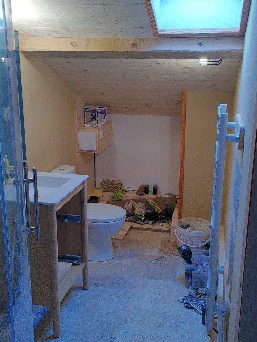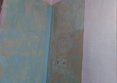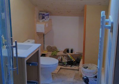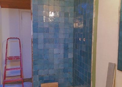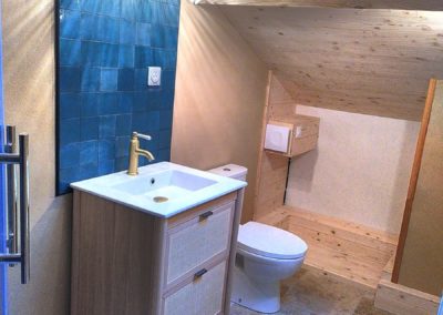 -Enduit argile ton crème au dessus du lavabo et ton naturel pour le reste de la pièce, très bon régulateur d’humidité.