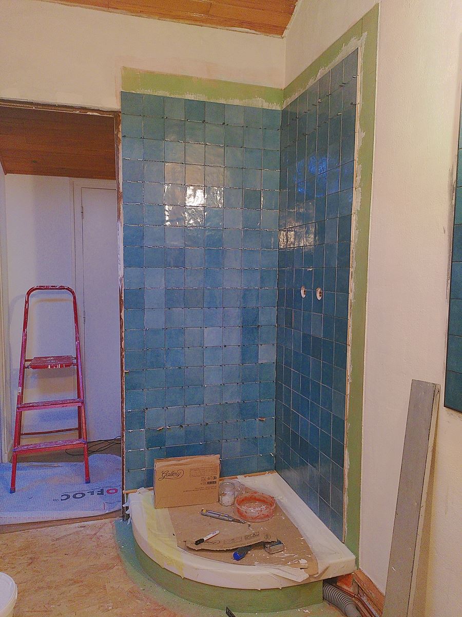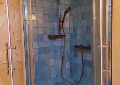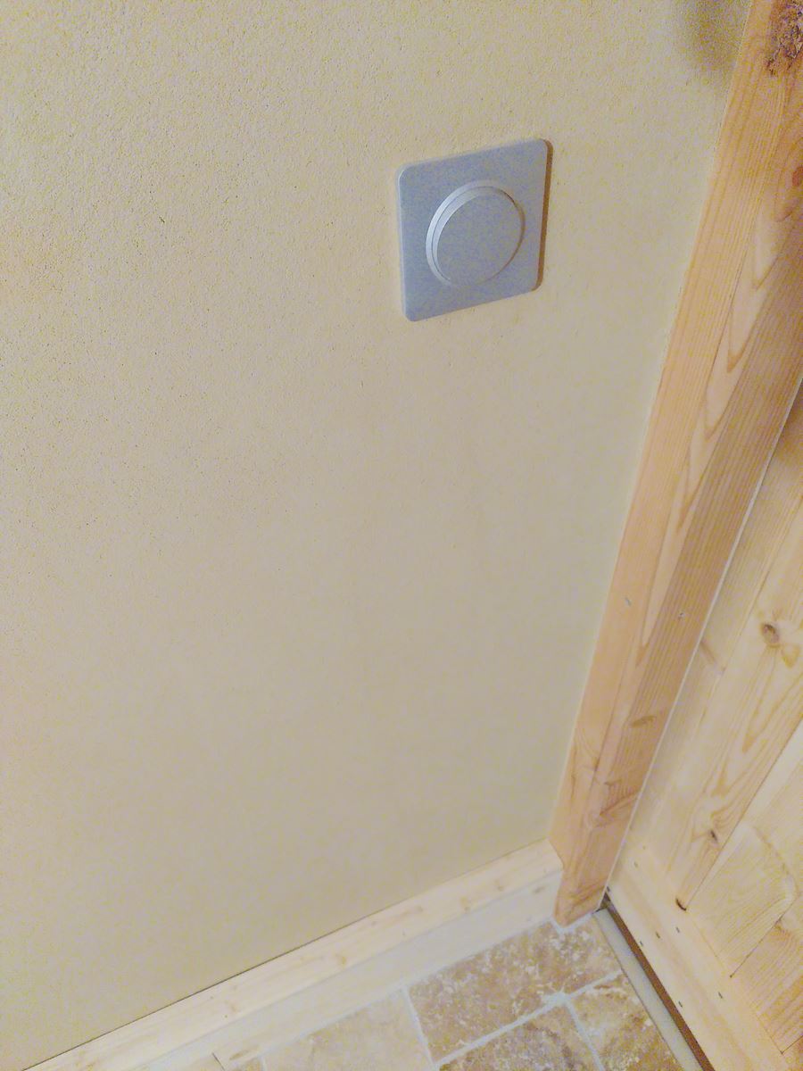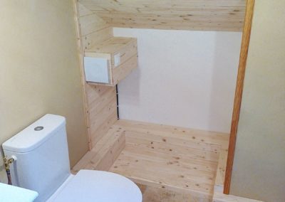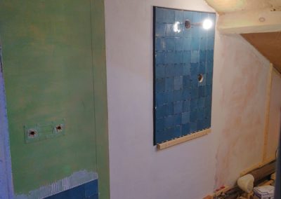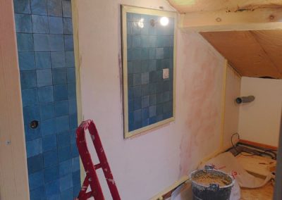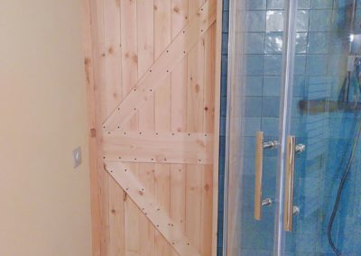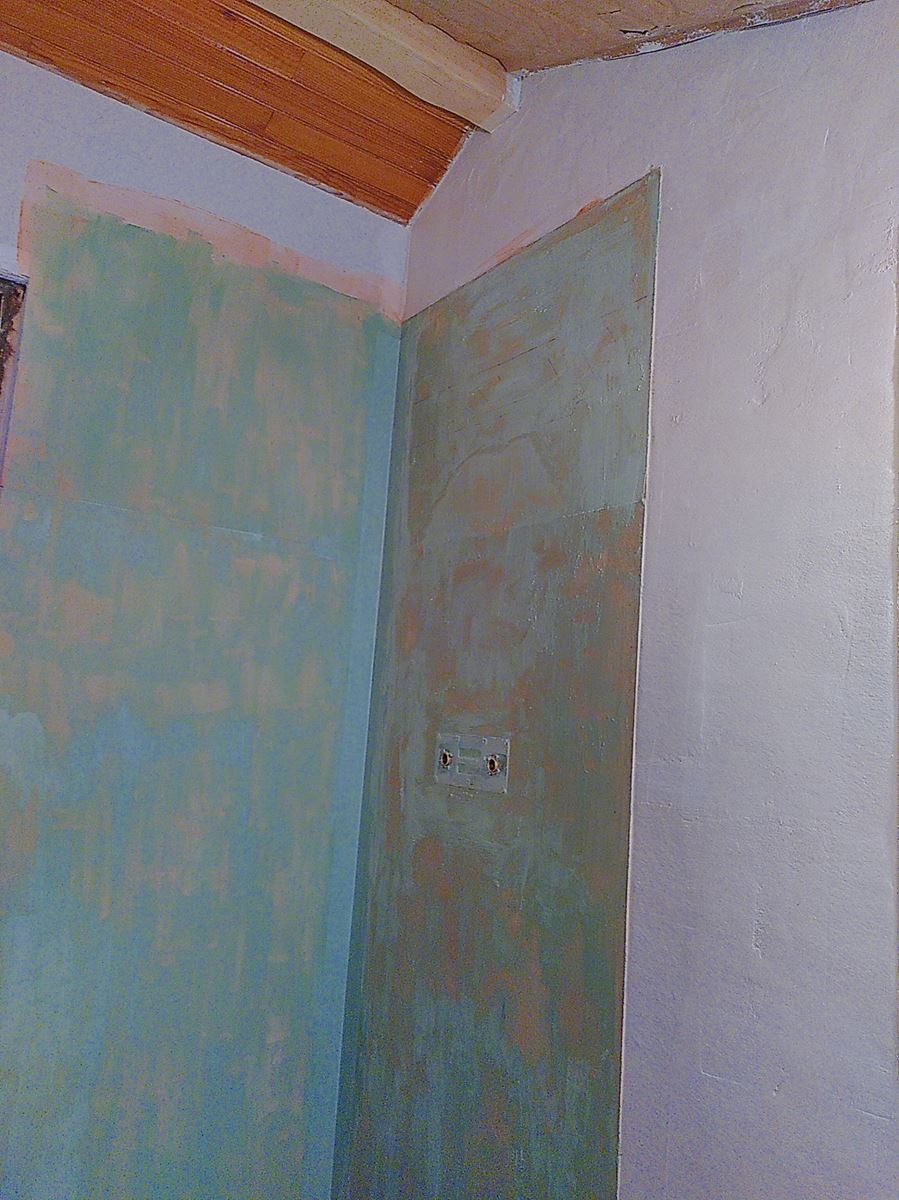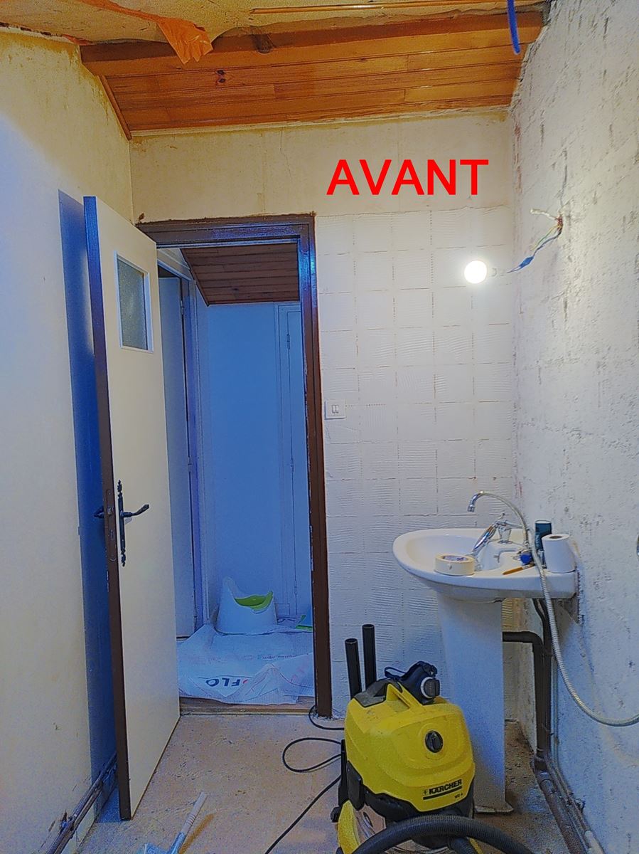 -Enduit argile ton crème au dessus du lavabo et ton naturel pour le reste de la pièce, très bon régulateur d’humidité.