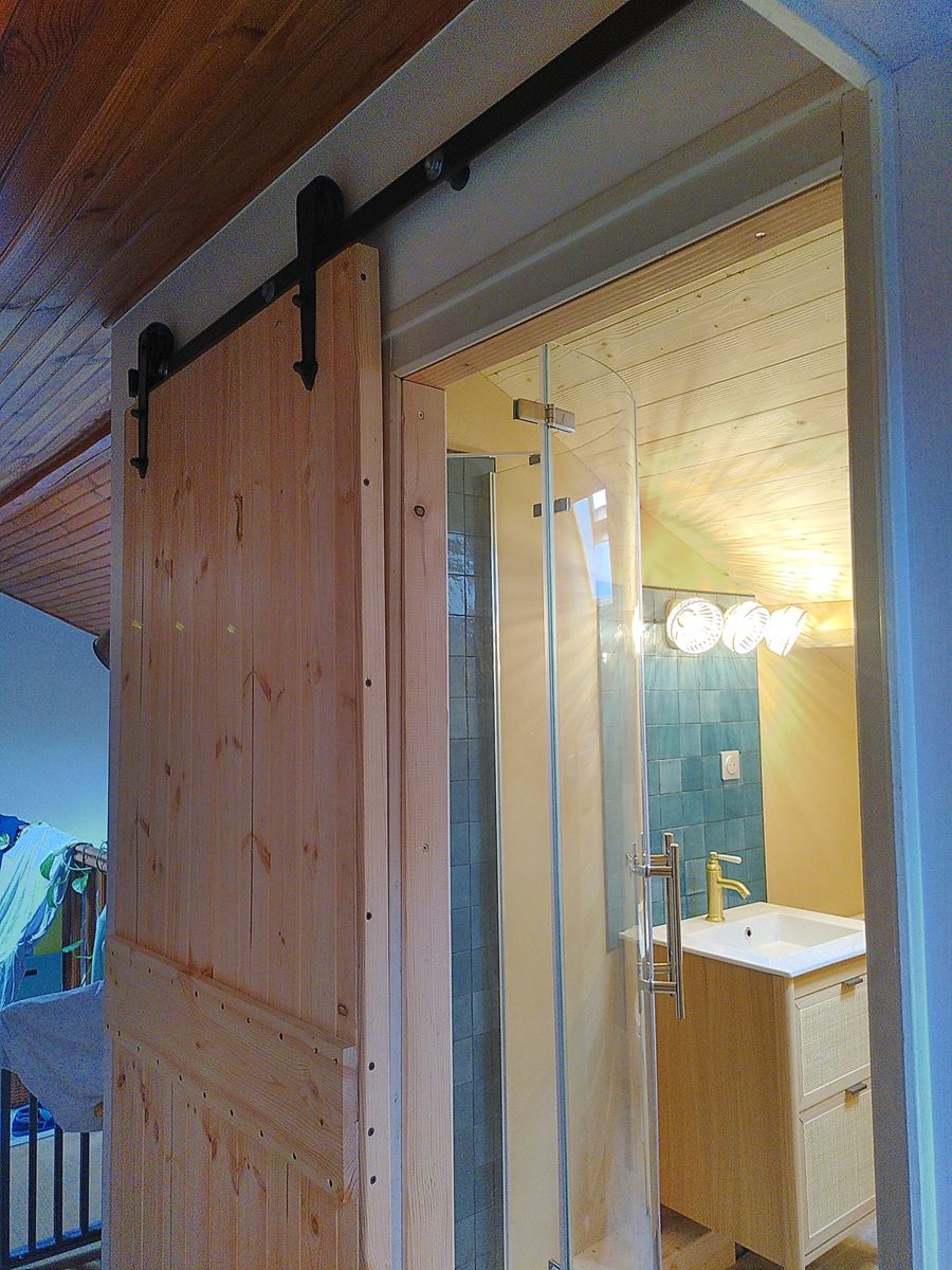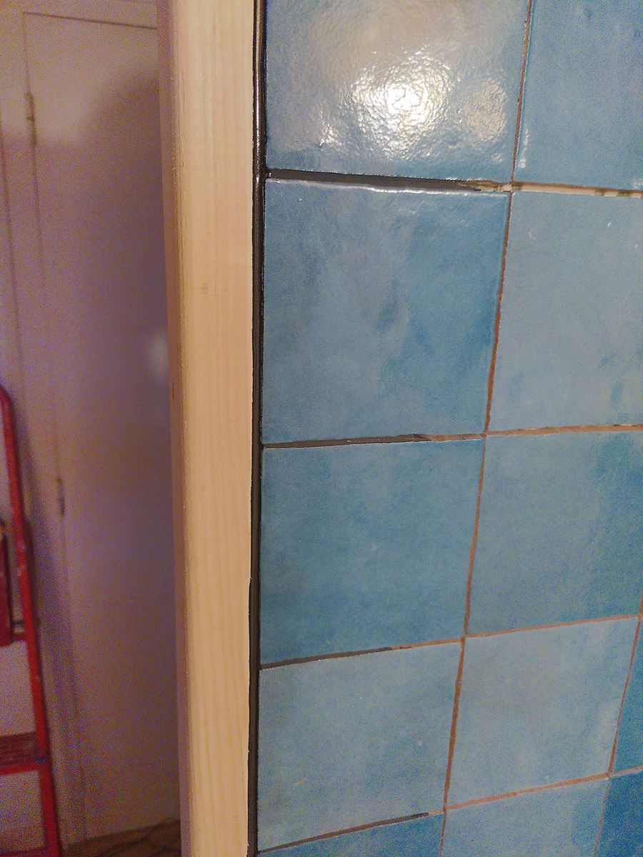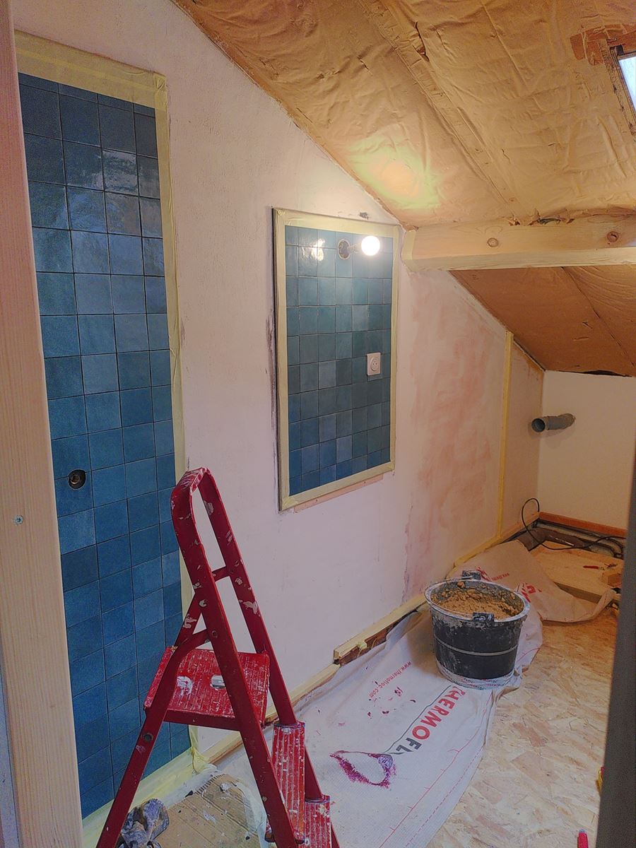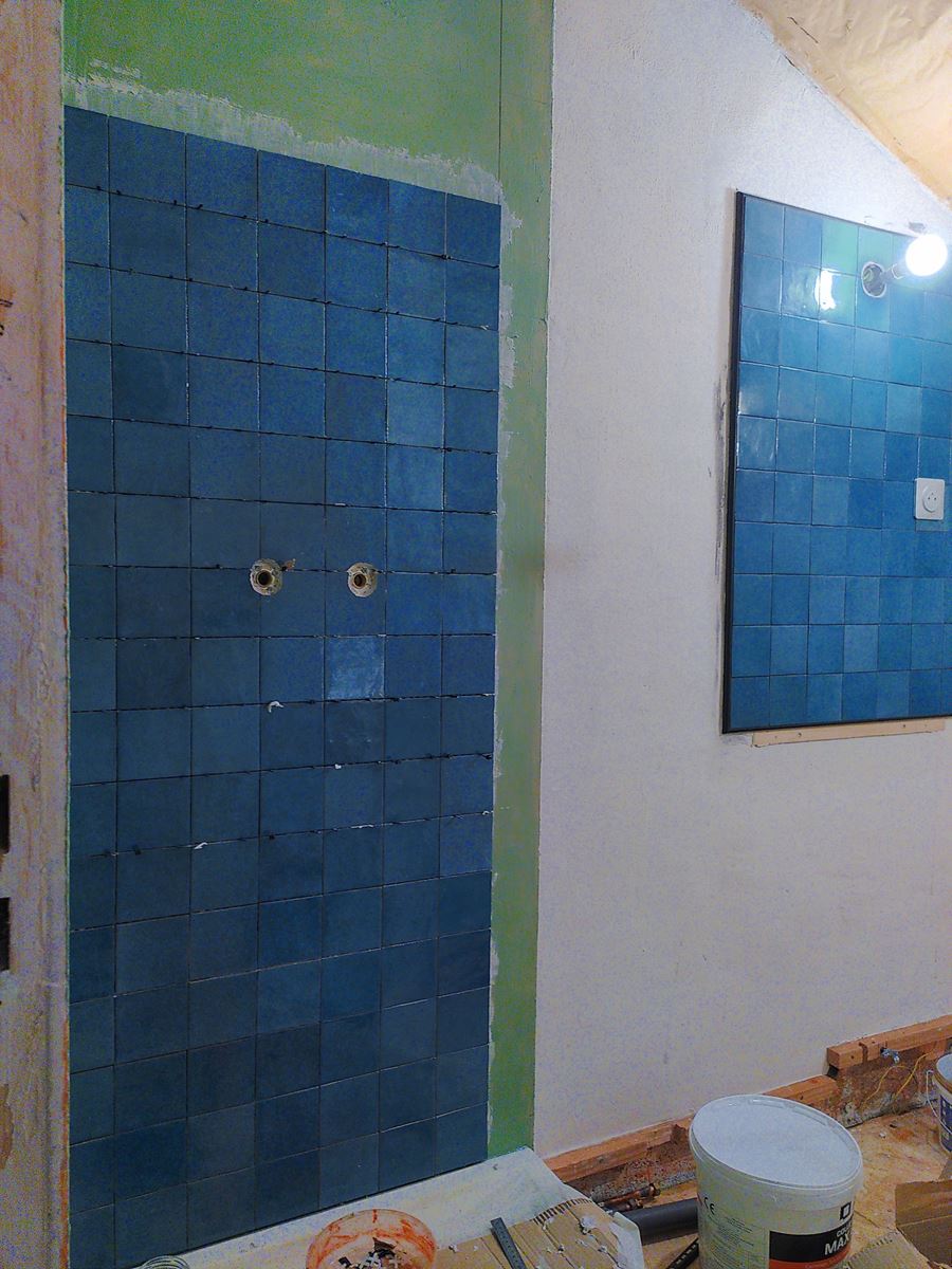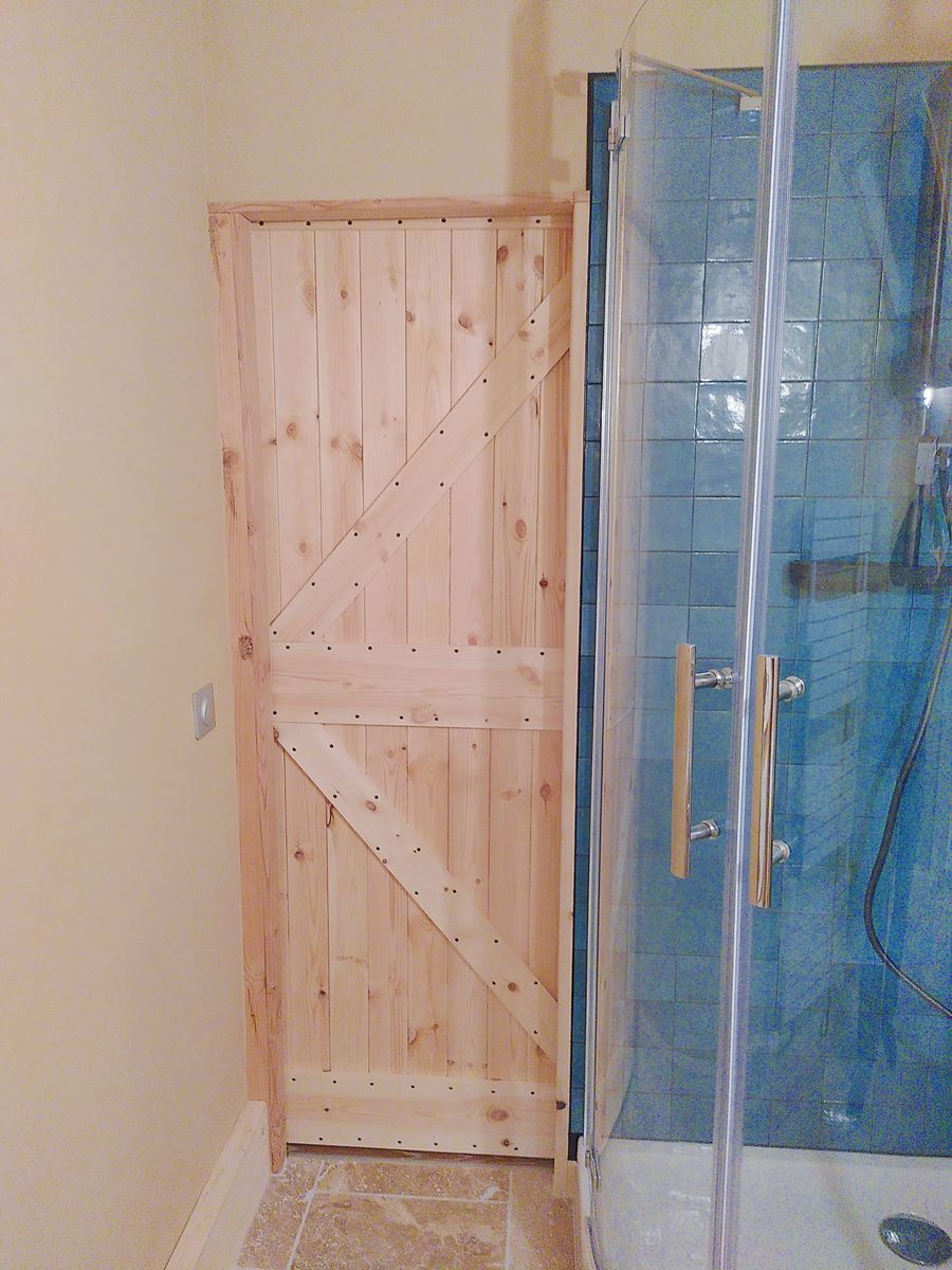 -Enduit argile ton crème au dessus du lavabo et ton naturel pour le reste de la pièce, très bon régulateur d’humidité.