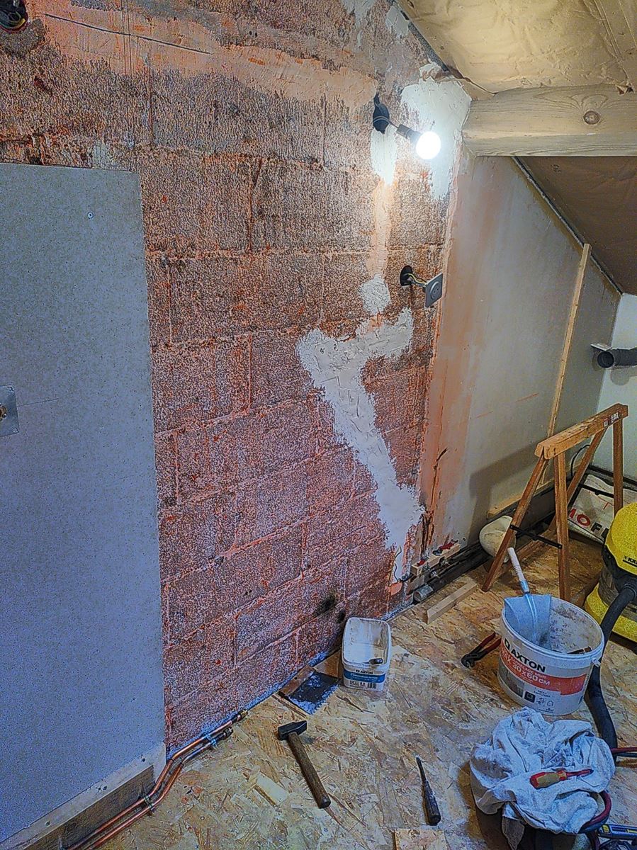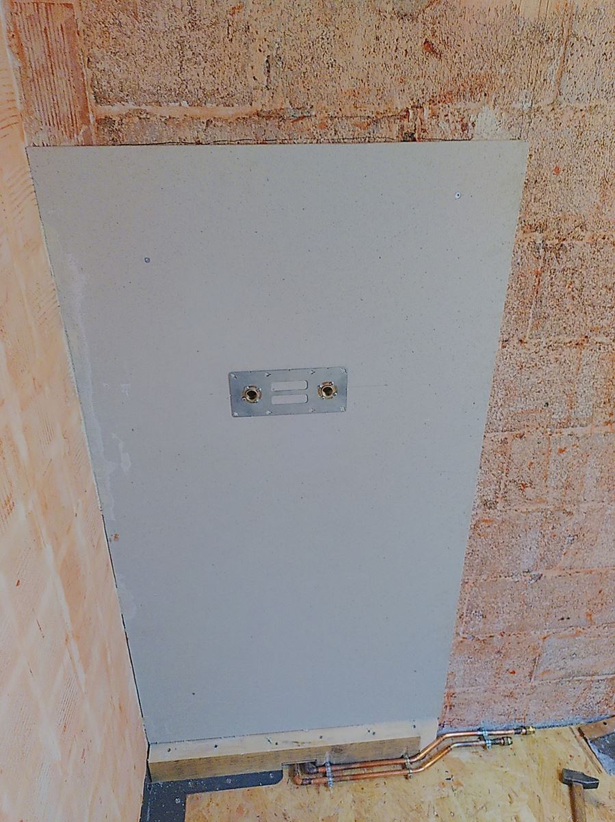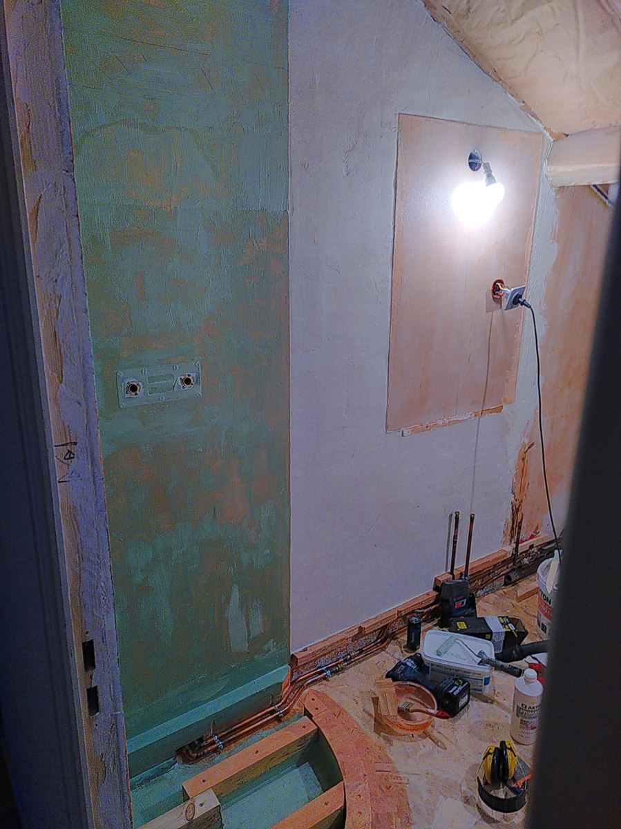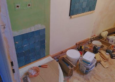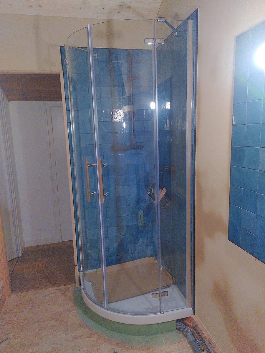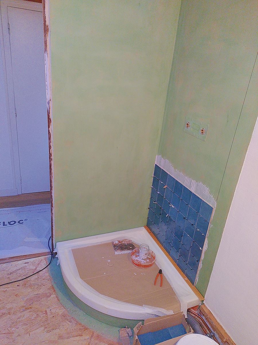 -Enduit argile ton crème au dessus du lavabo et ton naturel pour le reste de la pièce, très bon régulateur d’humidité.