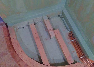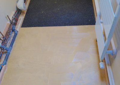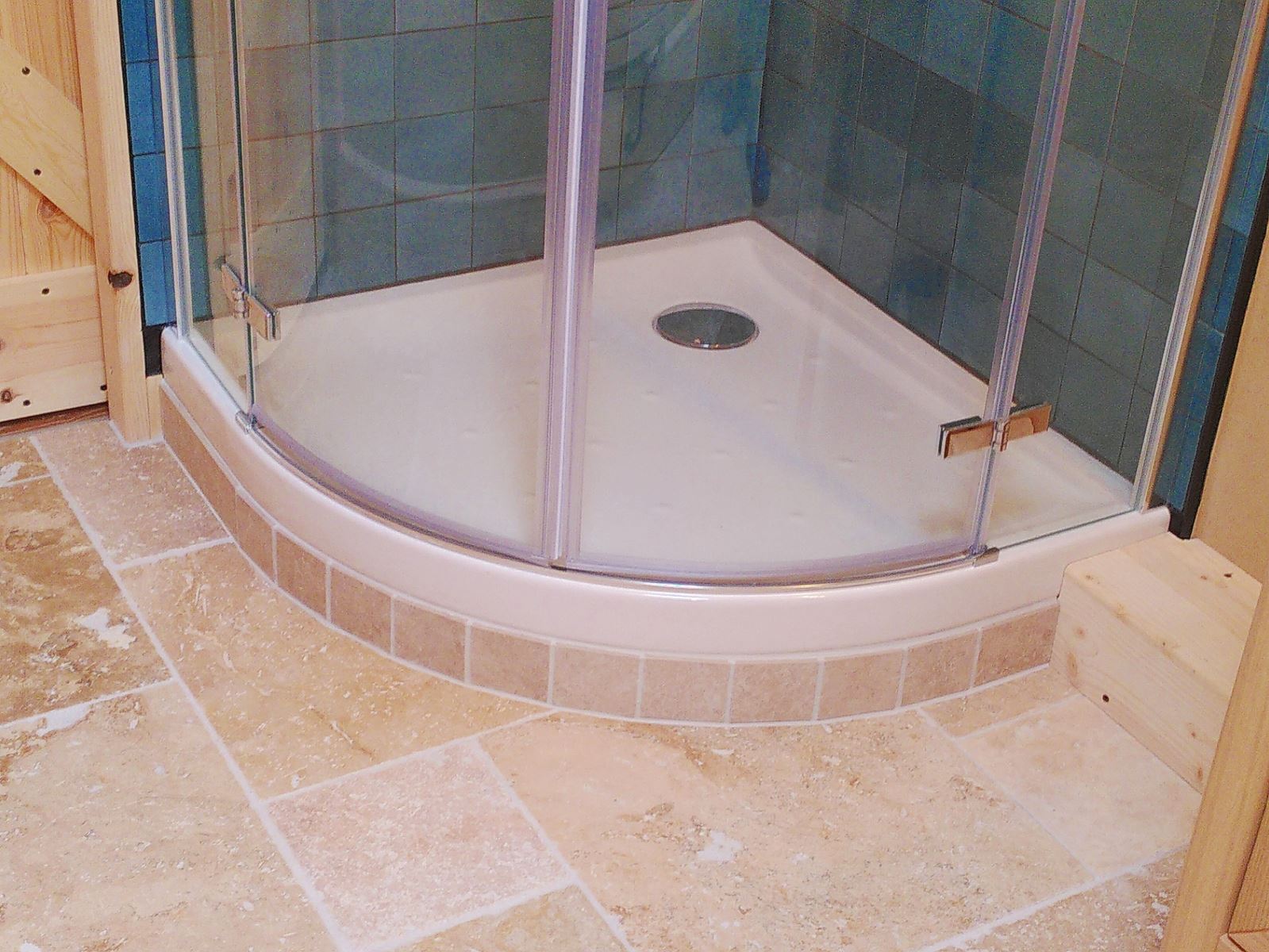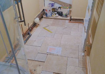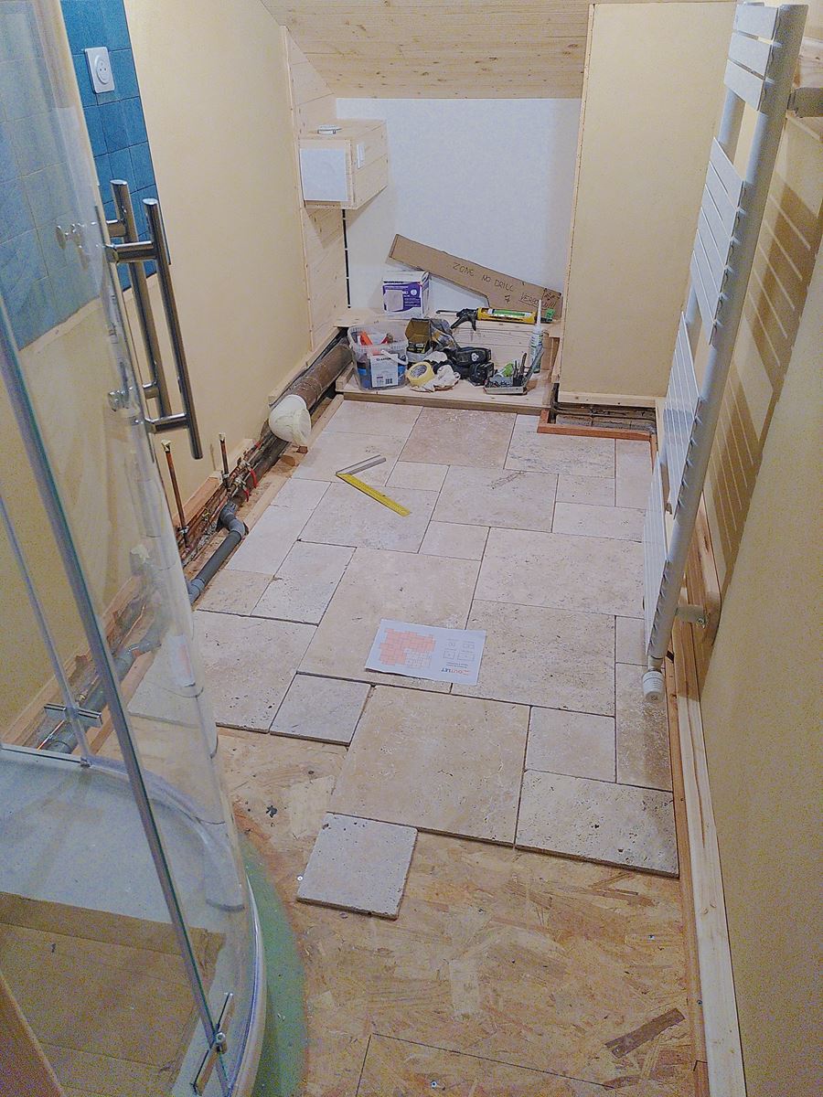 -Carrelage en pierre naturelle travertin, posé en « opus romain ».