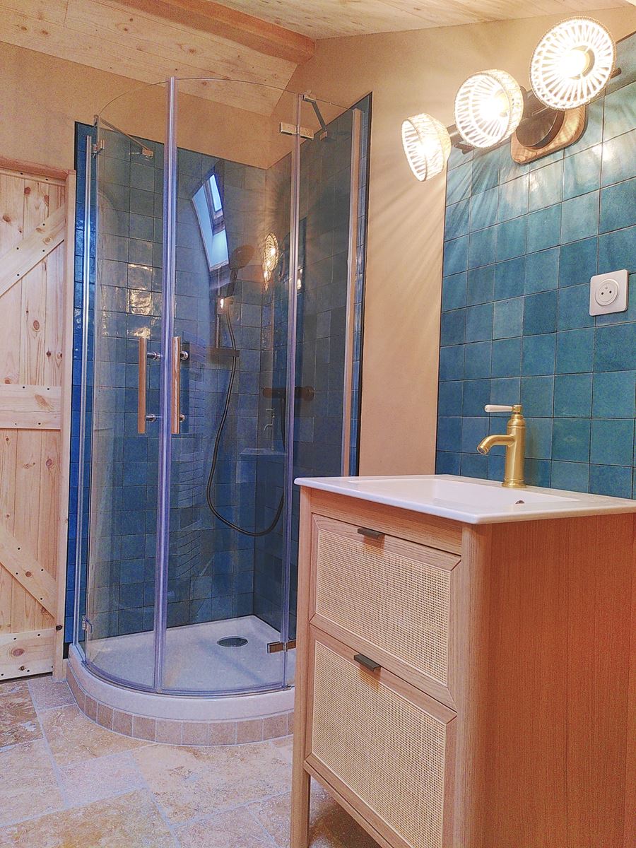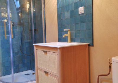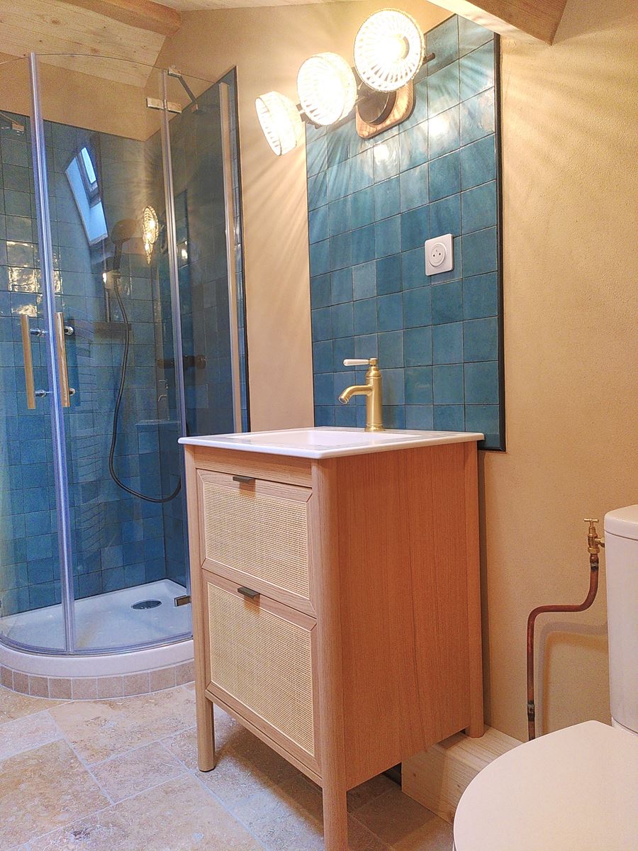 Réalisation d’une salle de bain aux tons chauds et naturels.