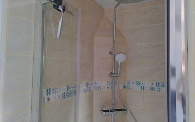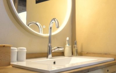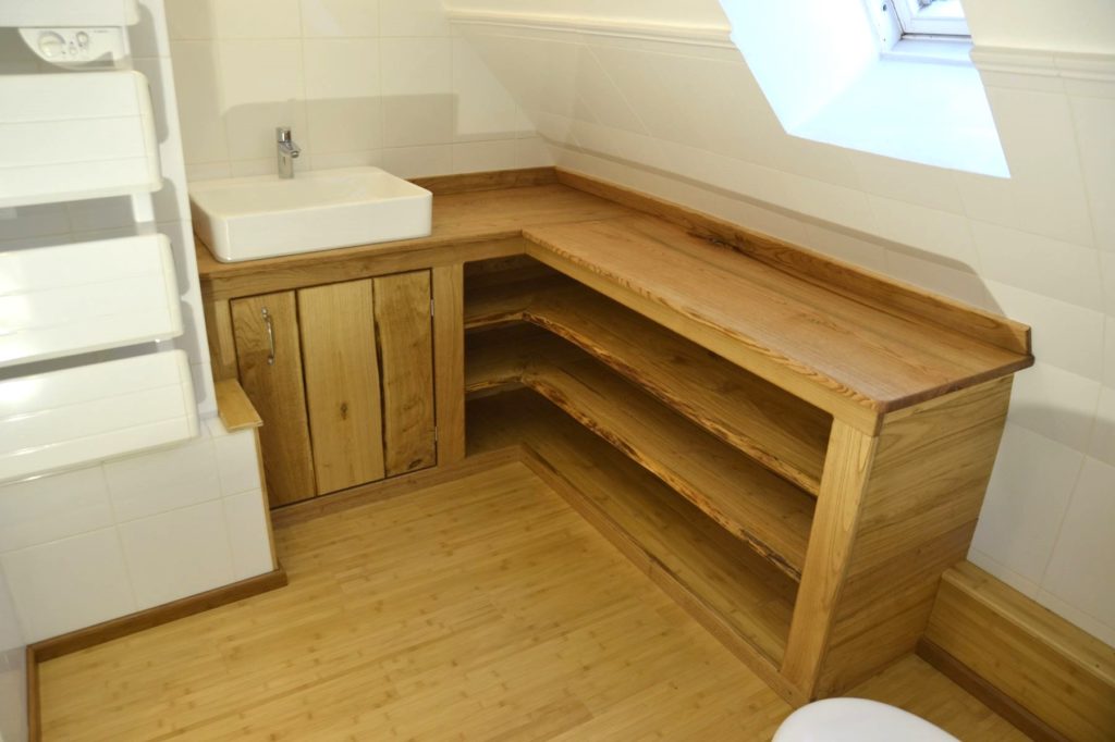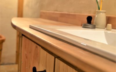 Douche carrelée… Enduit terre aux murs… meuble bois massif… La salle de bain du sol au plafond !